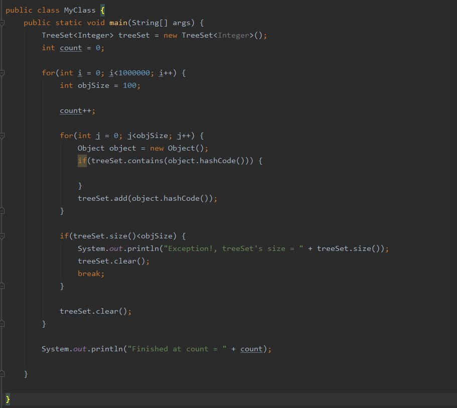 만약 중복이 발생한다면 생성된 object의 갯수(objSize)와 treeSet의 크기가 일치하지 않을 것이다.
